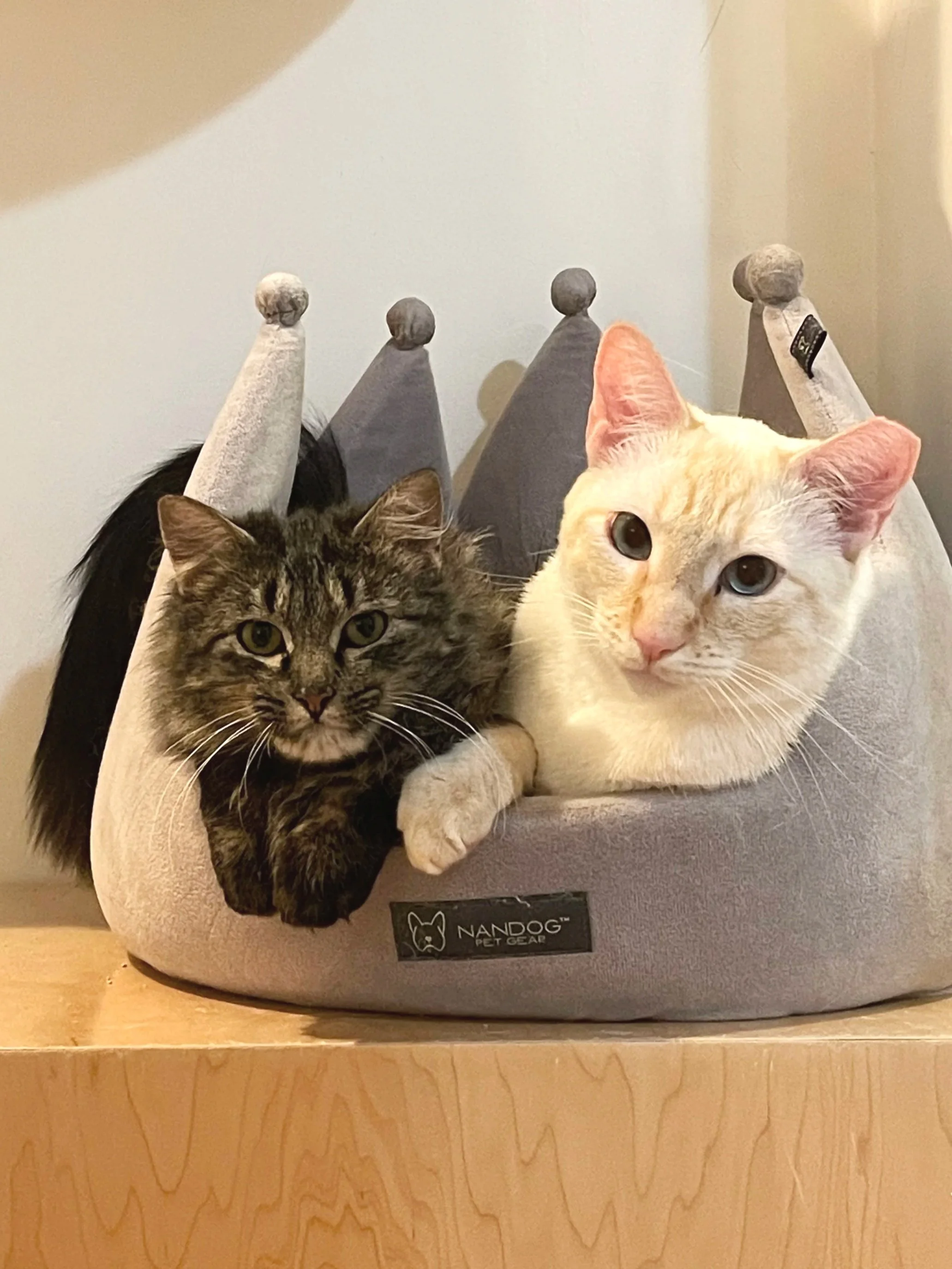 Ollie and Pip arrived at the city shelter scared and shutdown in April 2023 after their caretaker passed away. Pip was quick to hiss and hide, Ollie was sweet but withdrawn, and both needed extensive patience, time, and medical care that made them easy to overlook. After almost three years with Cat Town fosters, the two bonded seniors slowly built up their courage, learning to trust pets and playtime, and bravely accepting and eventually enjoying human companionship. After 1,060 days, their final foster guardians chose to make their journey and care part of their lives, and adopted them together.