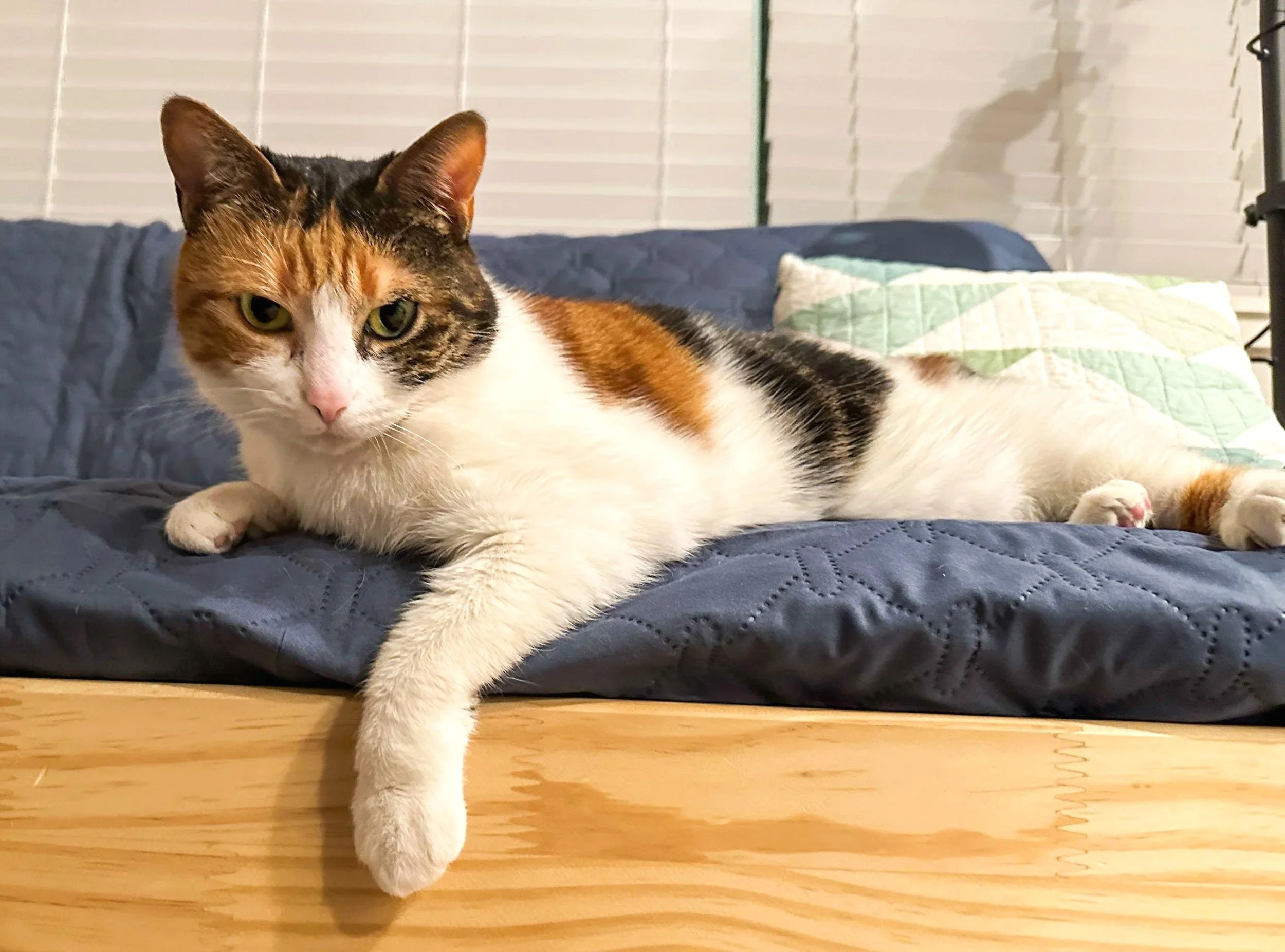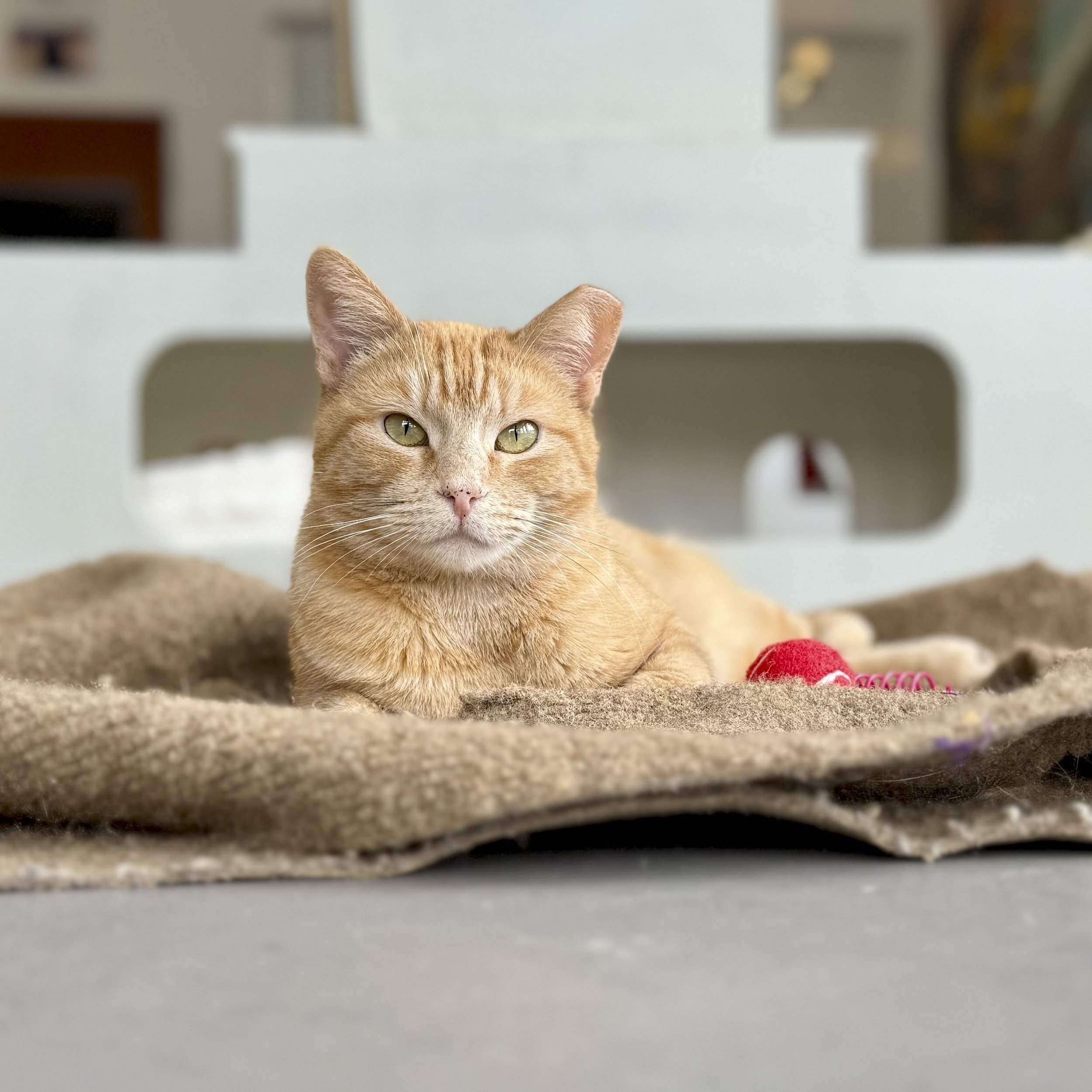 After being surrendered to the city shelter for being too vocal, 7-year-old Pebbles became stressed in her cage and came to Cat Town for a place to decompress and feel safe. In her foster home, this shy senior took a little while to get used to her new environment, and then confidently let her cozy and sweet side shine. She loved asking for pets, cuddling, and playing with her toys. Her foster observed that sometimes she’d get very stressed and would hide and vocalize when she was left alone even if for a few minutes, and would nervously come back out for companionship as soon as someone returned. Soon she settled into a secure and happy routine, and did well with a special diet that helped her get down to a healthy weight. Her adopter shared: “Pebbles is doing great! She's acclimating well to the new environment: she's not shy about asking for pets and seems comfortable with the new space.”