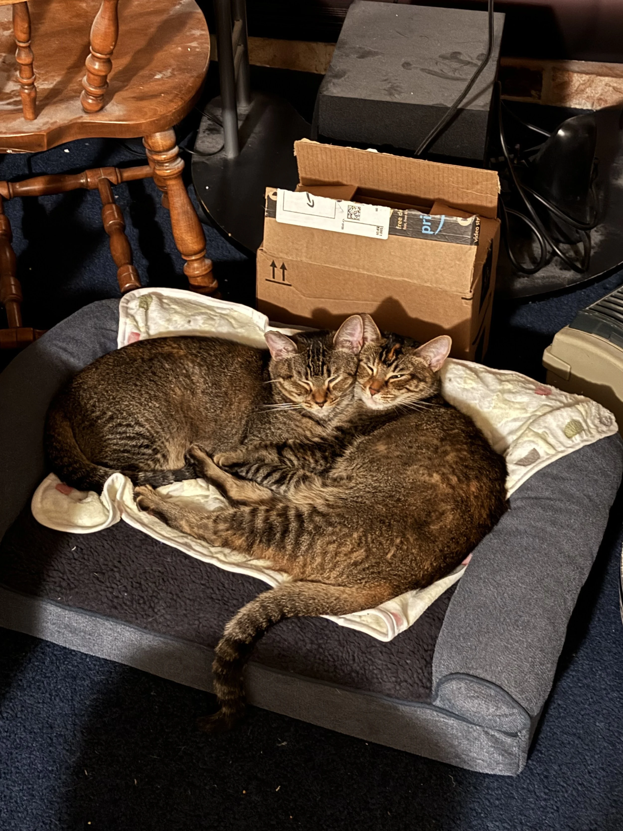 Sonic and Flash came in as two very shut-down 10-month-old tabbies. At first, I couldn’t even tell them apart — until I noticed Flash had that little orange streak on her forehead, like a lightning bolt. Both were pretty hissy, ears back, hiding in the corner, not wanting to be looked at, and definitely not wanting to be pet. They barely wanted to play or even take churu. They were just so scared.